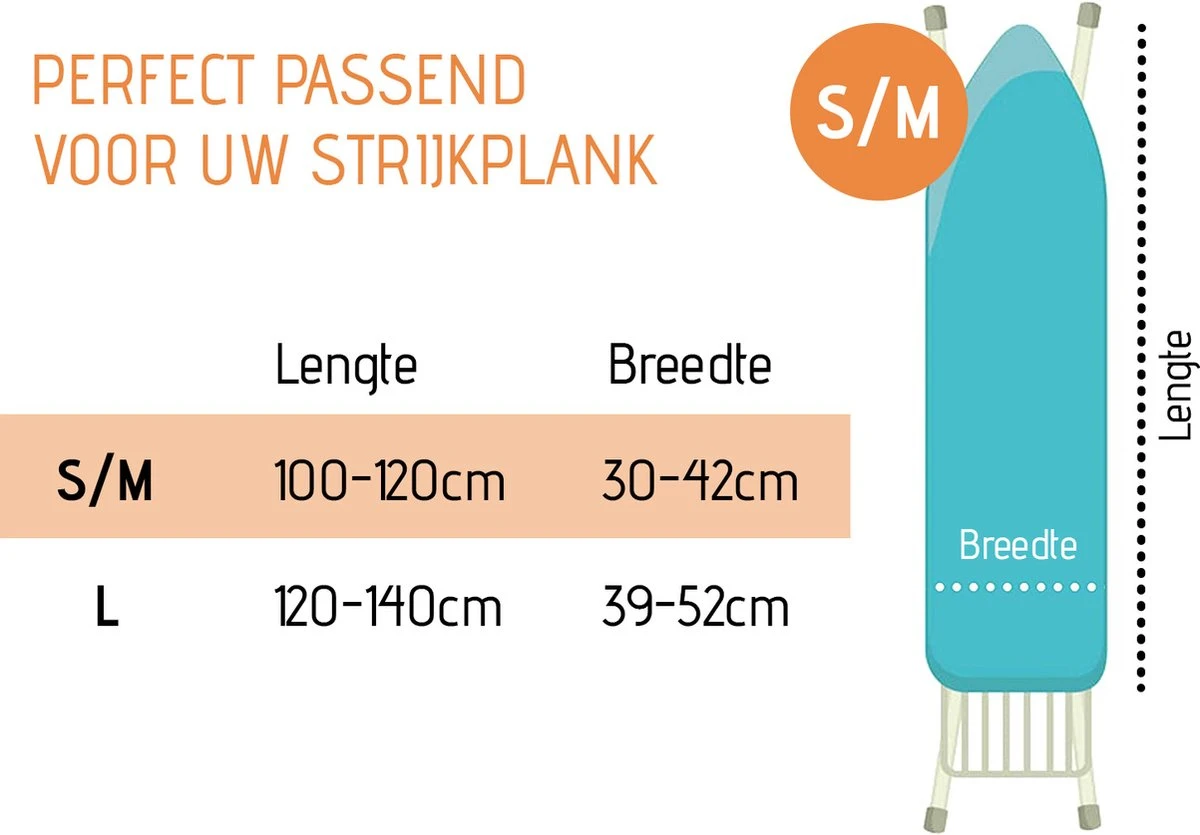 - VERSATIEL – De universele strijkplankhoes is compatibel met alle merken en verkrijgbaar in 2 praktische maten. Maat M is geschikt voor een wijdte (30-42 cm) en een lengte (100-120 cm) en maat L is geschikt voor een wijdte (39-52 cm) en een lengte (120-140 cm).