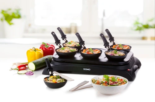 Met de DOMO DO8710W gourmetstel haal je een set in huis waarmee je met een gezin van 6 personen van aan tafel gewokte maaltijden geniet. De kleine pannen zijn door de antiaanbaklaag gemakkelijk schoon te krijgen. Met 1000 watt aan vermogen wordt het onderstel snel heet, waardoor je dus niet lang te wacht voor je bakt. Geen zin om te wokken, maar trek in ouderwetse Hollandse pannenkoeken? Je verwijdert simpelweg alleen de pannetjes en bakt de pannenkoekjes in de handig geïntergreerde bakplaten. Een meegeleverde pollepel maakt het bakken makkelijk.