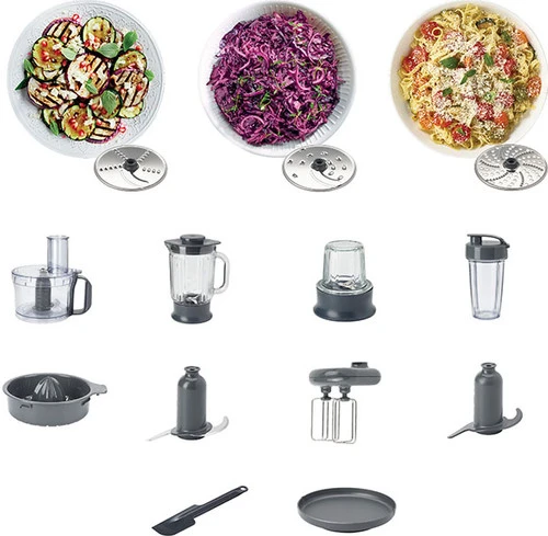 Bij deze foodprocessor zit ook een blender, citruspers, drinkbeker en klopgardes.
