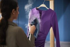 De verticale stoomfunctie kunt u kledingstukken op de hanger opfrissen en kreuken uit gordijnen verwijderen terwijl ze hangen. Geen strijkplank nodig.