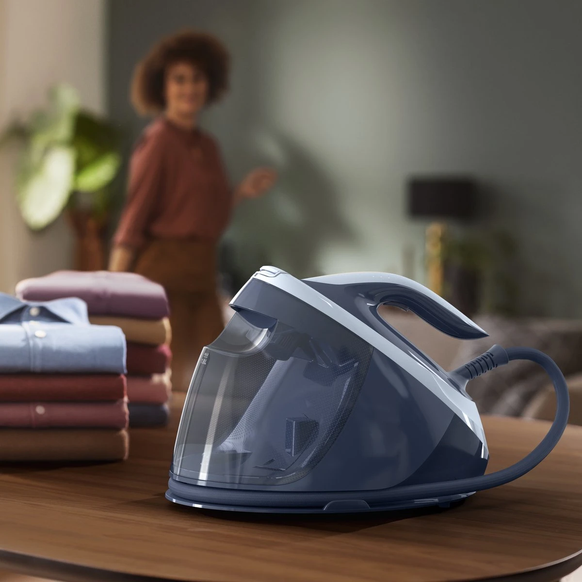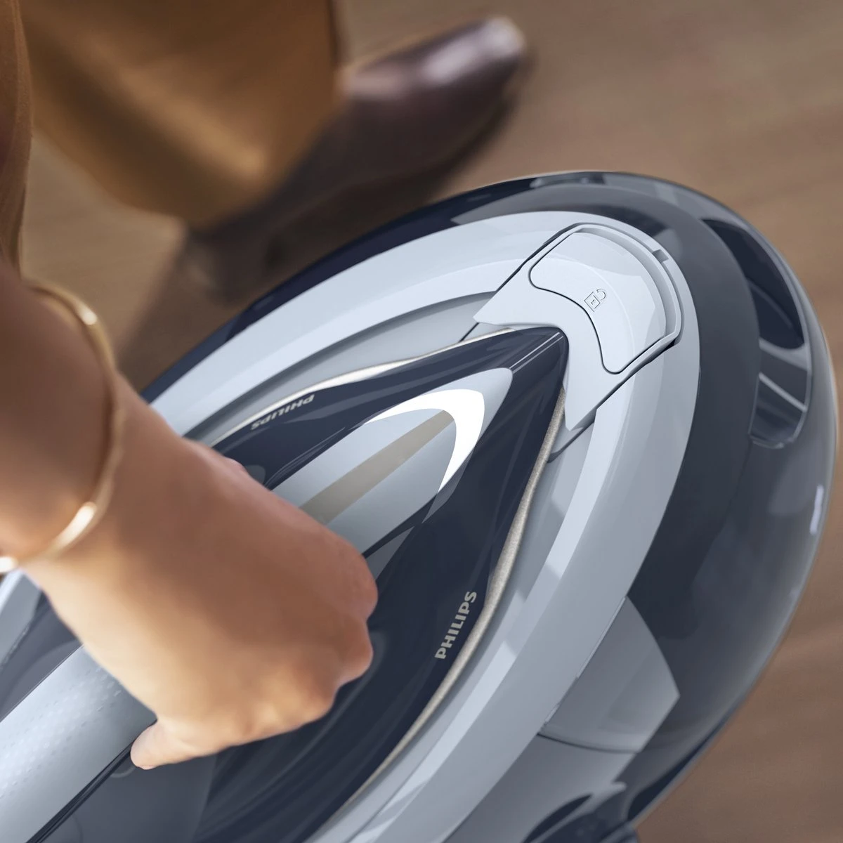Vergrendel de strijkijzer veilig op het basisstation om het eenvoudig overal in huis te kunnen dragen en het risico van contact met de hete zoolplaat te beperken.