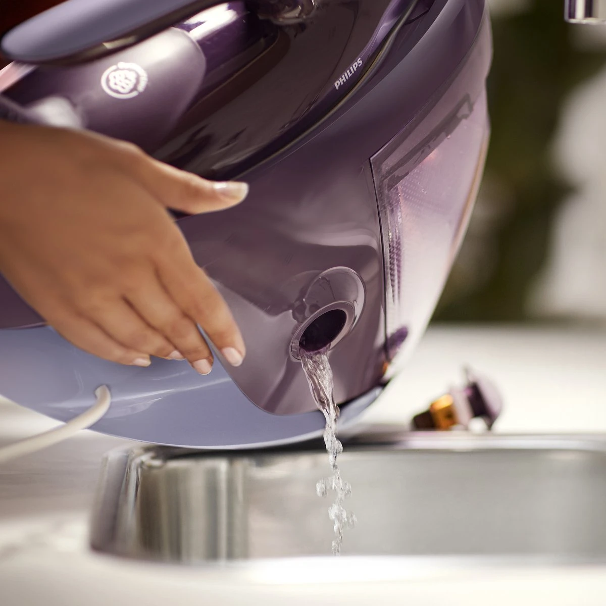 Regelmatig ontkalken beschermt jouw strijkijzer, verlengt de levensduur en zorgt voor de beste stoomprestaties. Het exclusieve Easy De-Calc-systeem verzamelt continu kalkaanslag en is uitgerust met een indicatielampje om je te laten weten wanneer het moet worden geleegd. Haal de stekker uit het stopcontact en laat het water en de kalkdeeltjes wegstromen.