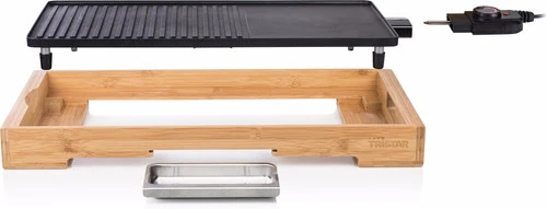 Dankzij de grote bakplaat is deze Tristar Bamboo Grill XL BP-2641 geschikt voor grote gezinnen van 6 personen. De bakplaat beschikt zowel over een geribbelde kant – lekker voor je biefstukje – als een vlak gedeelte. Maar wat je ook grilt of bakt, voor aanbranden hoef je niet bang te zijn. De gehele plaat is namelijk voorzien van een antiaanbaklaag. Door het hoge vermogen van 2200 watt is deze tafelgrill snel opgewarmd, en met de thermostaat aan het snoer regel je de temperatuur heel precies. Is iedereen uitgegeten, dan koppel je het snoer los en neem je de plaat uit. Zet ‘m in heet water, haal er een uurtje later een doekje eroverheen en uitbuiken maar.